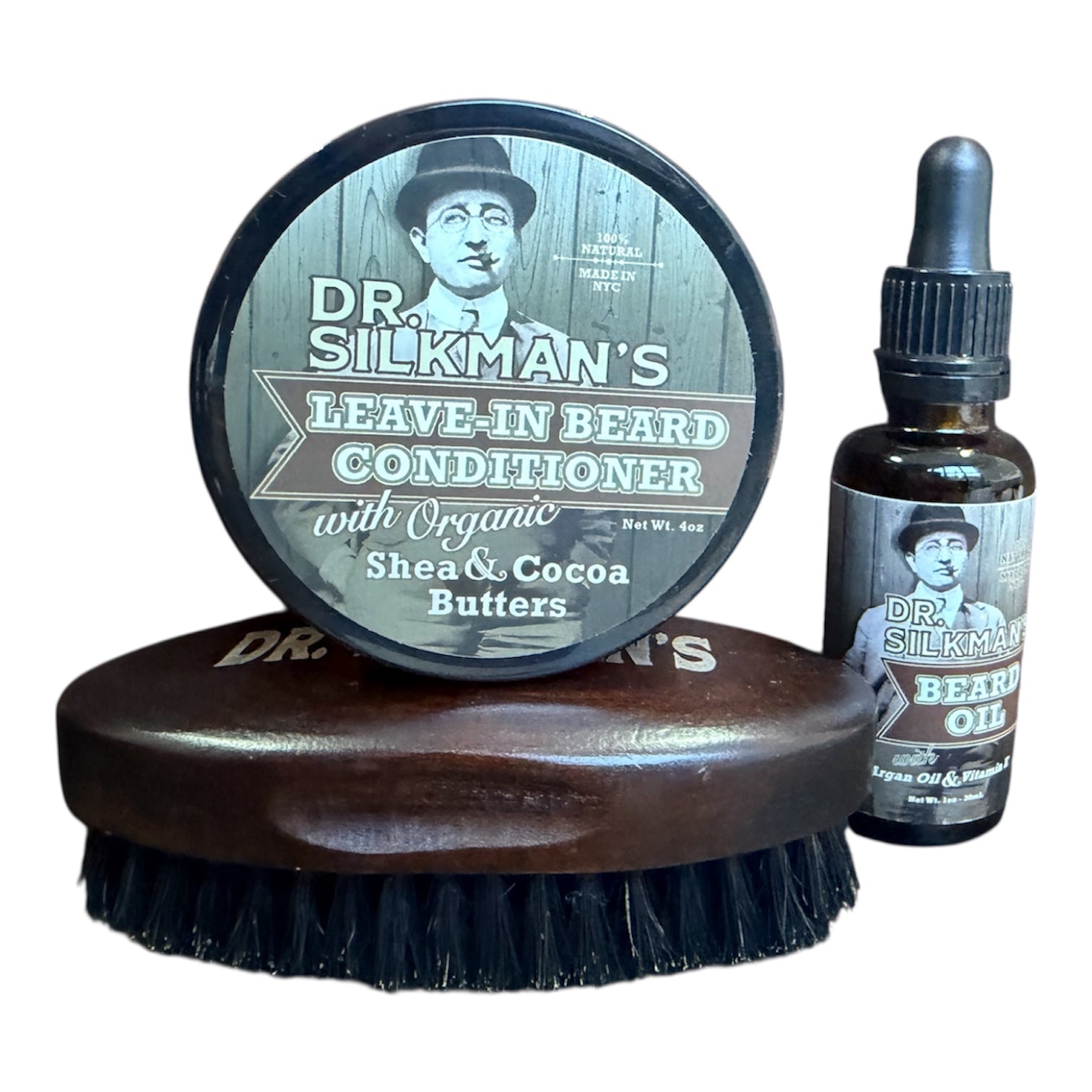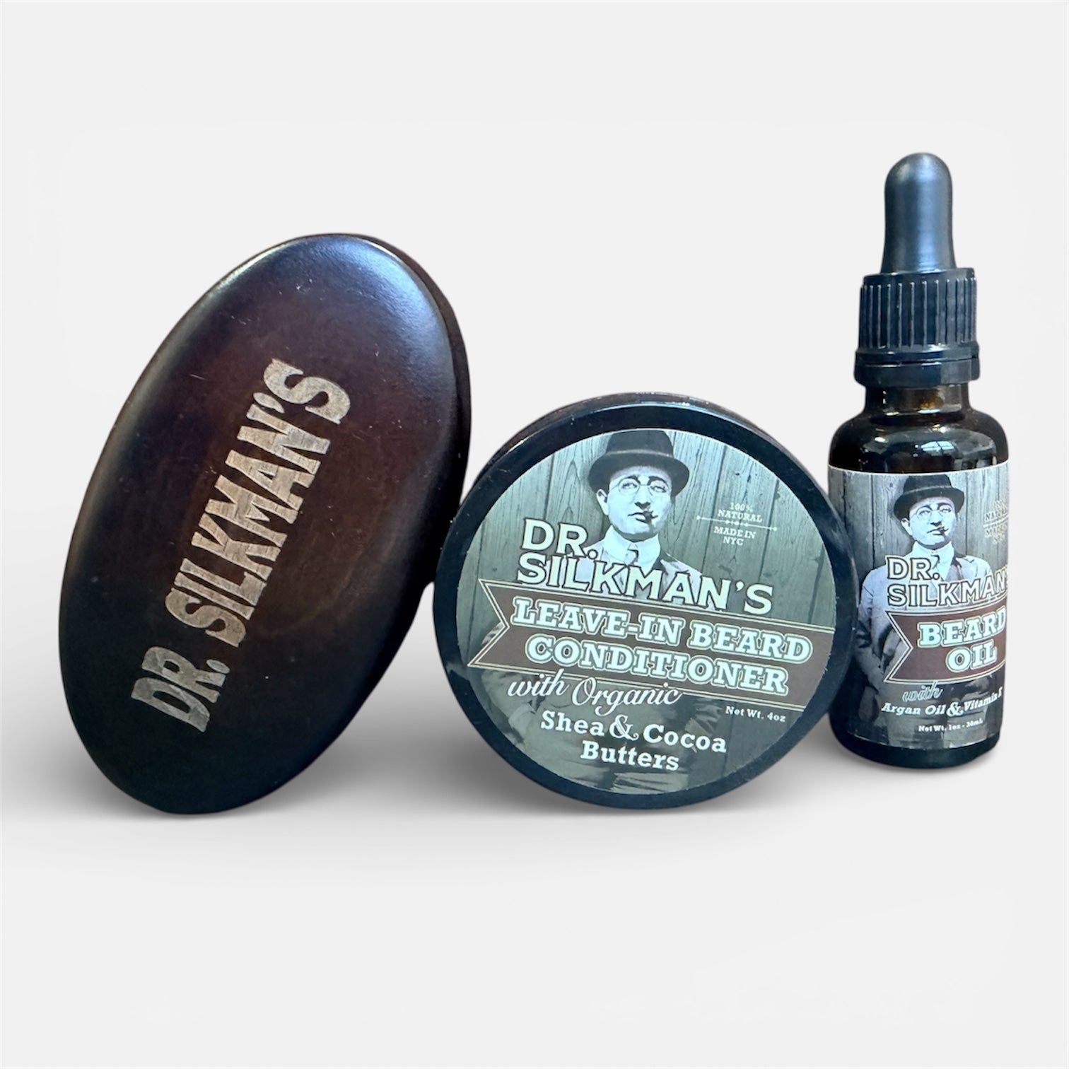 The 3-piece Beard Care Set promises premium care for your facial hair. It houses a 4oz Leave In Beard Conditioner, a 1oz Dr. Silkman’s Beard Oil, and a boar's bristle Beard Brush.